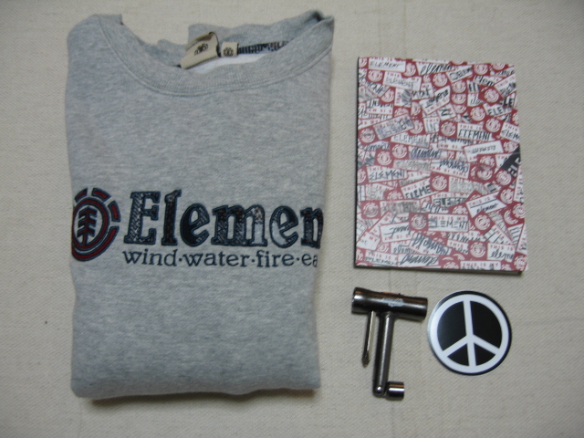 まずは、エレメントのパーカー、次にエレメントのDVD、そしてスケートレンチ、最後にピースマークのステッカー